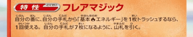 マフォクシーの特性”フレアマジック”は、手札から基本炎エネルギーをトラッシュすることで、手札が7枚になるようにドローできる効果です。