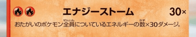 マフォクシーの技”エナジーストーム”は、炎エネルギー2つでお互いのポケモンについているエネルギーの数×30ダメージを与える技で、優秀な青天井技をもっています。